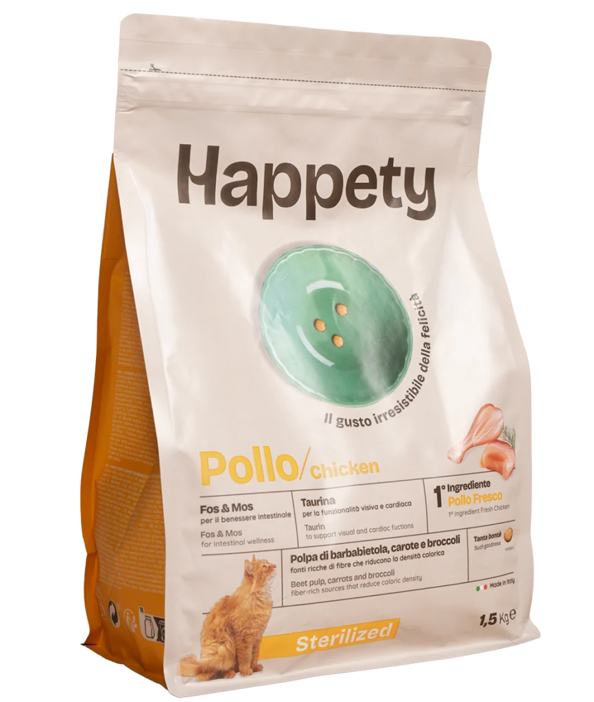 Fresh chicken 14 %, Rice 14%, Dehydrated poultry proteins 14%, Wheat, Maize gluten, Dehydrated pork proteins 8%, Dehydrated animal proteins (beef, pork) 4%, Hydrolysed chicken proteins, Chicken fat, Maize, Dried beet pulp 2,5%, Lignocellulose, Inactivated yeasts, Minerals, Dried apple pulp 0,5%, Chicory inulin – source of FOS 0.3%, Dried carrots 0.2%, Dried broccoli 0.2%, Yeasts products – source of MOS 0.2%, Yucca Schidigera (250 mg/kg).