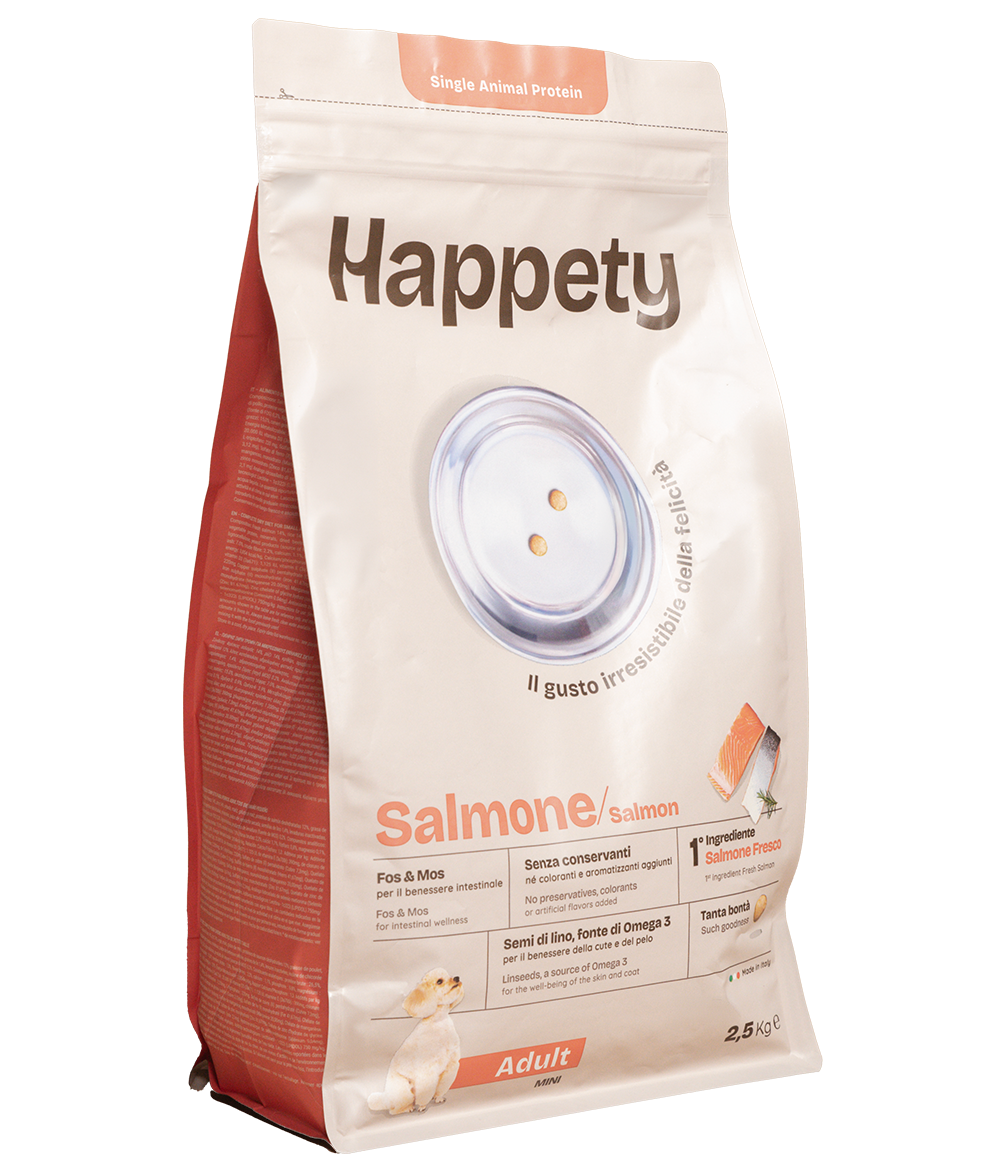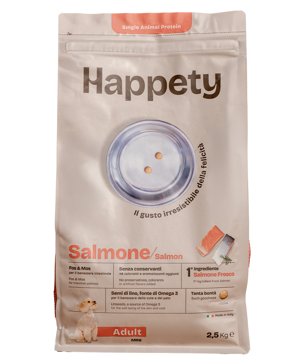 Fresh salmon 14%, Rice 14%, Barley, Maize, Maize gluten, Dehydrated salmon proteins 12%, Chicken fat, Hydrolysed vegetable proteins, Minerals, Dried beet pulp, Linseed 1,4%, Inactivated yeasts, Chicory inulin – source of FOS 0.3%, Lignocellulose, Yeasts products – source of MOS 0.2%